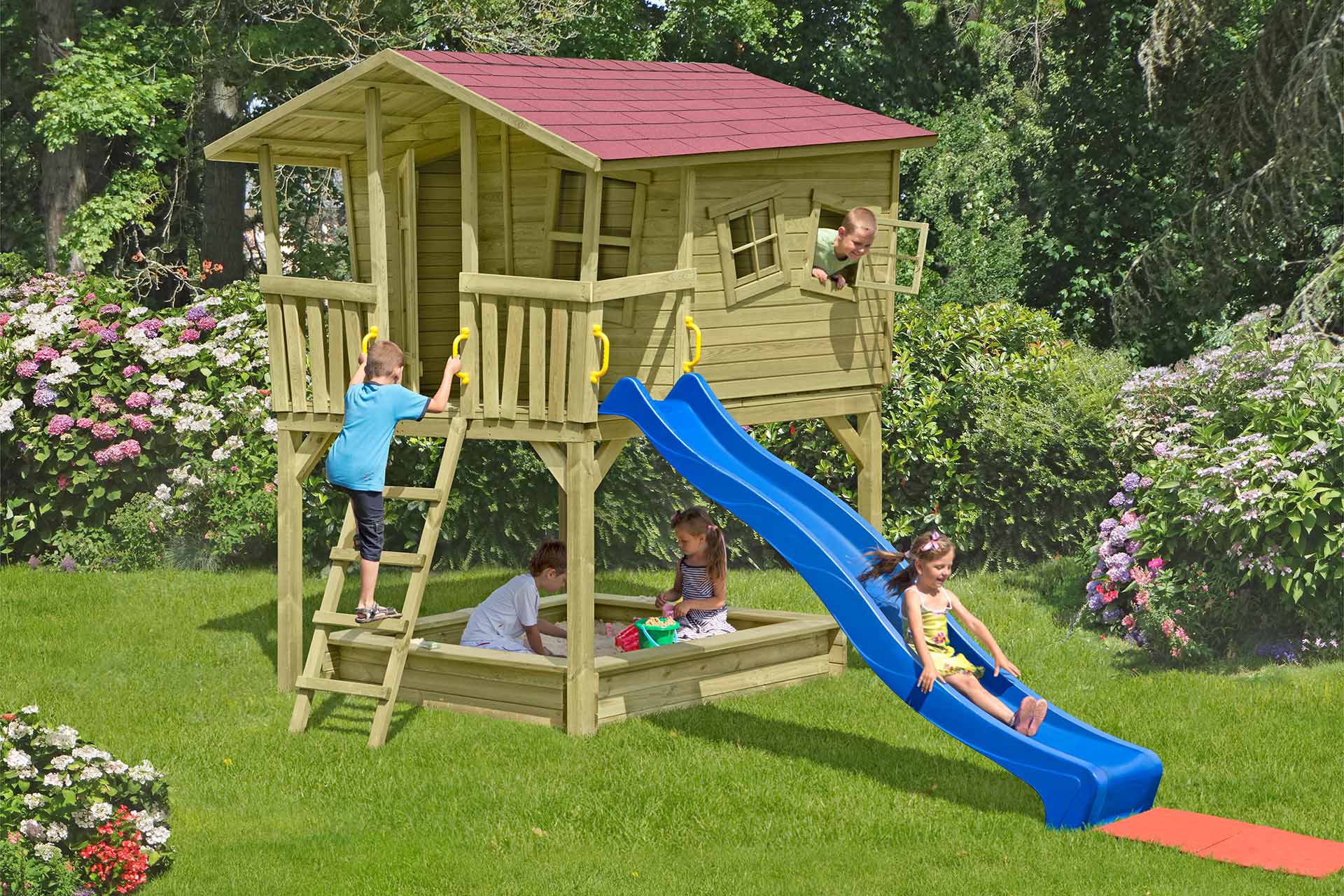 Bitte beachten Sie, dass Zubehörteile wie Schaukelanker, Anbauschaukel, Rutsche, Kunststoffgriffe, Fallschutzmatten und Sandkasten separat erhältlich sind und nicht im Lieferumfang des Spielhauses enthalten sind.